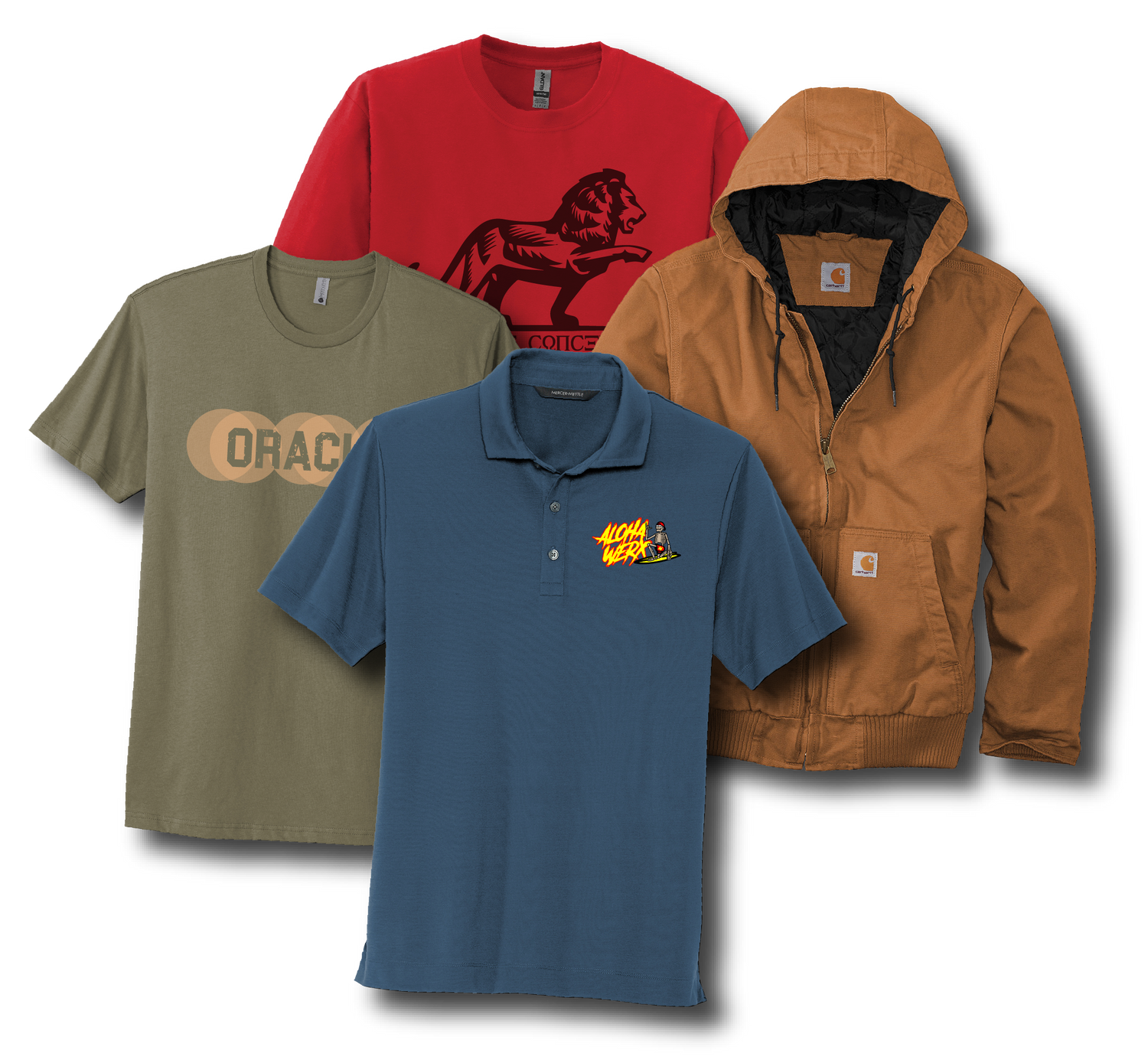 Popular Brands we like to use are but not limited to are: Next Level, Carhartt, Bella-Canvas, Sport-tek.