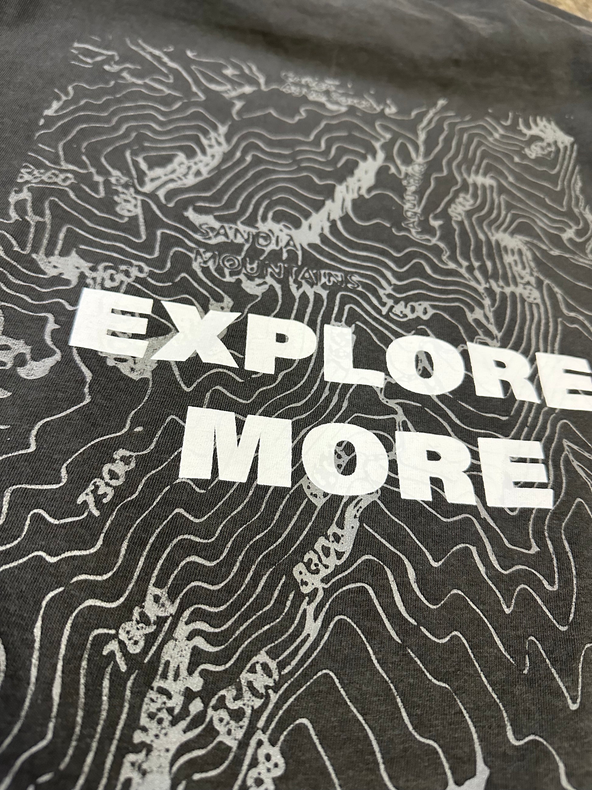 reflective ink on the front text and back print of a topographical map of the Sandia Mountains with a white contrast explore more